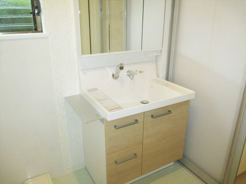 ・化粧台は今のサイズが大きすぎたので使い勝手の良いサイズへ変更し、給水管等確認できるように点検口も新たに設けました。