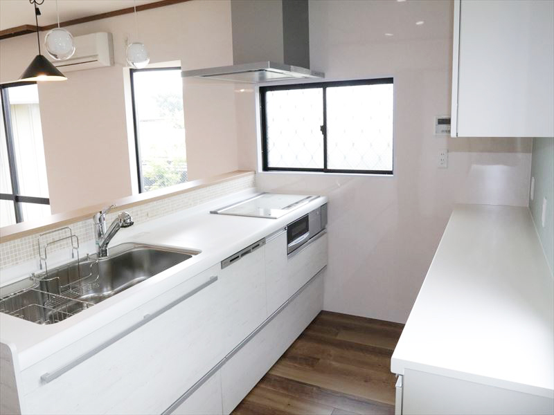| 商品仕様 | キッチン:クリナップ ラクエラI型(間口2550mm) 浴室:TOTO サザナ Tタイプ(1220サイズ) タイル:ダントー(株)モザイクタイル バニラモザイク(品番:VMP-11/モザイクP) 壁紙:サンゲツ AA級 フローリング:Panasonic アーキスペック(カラー:チェリー柄) |